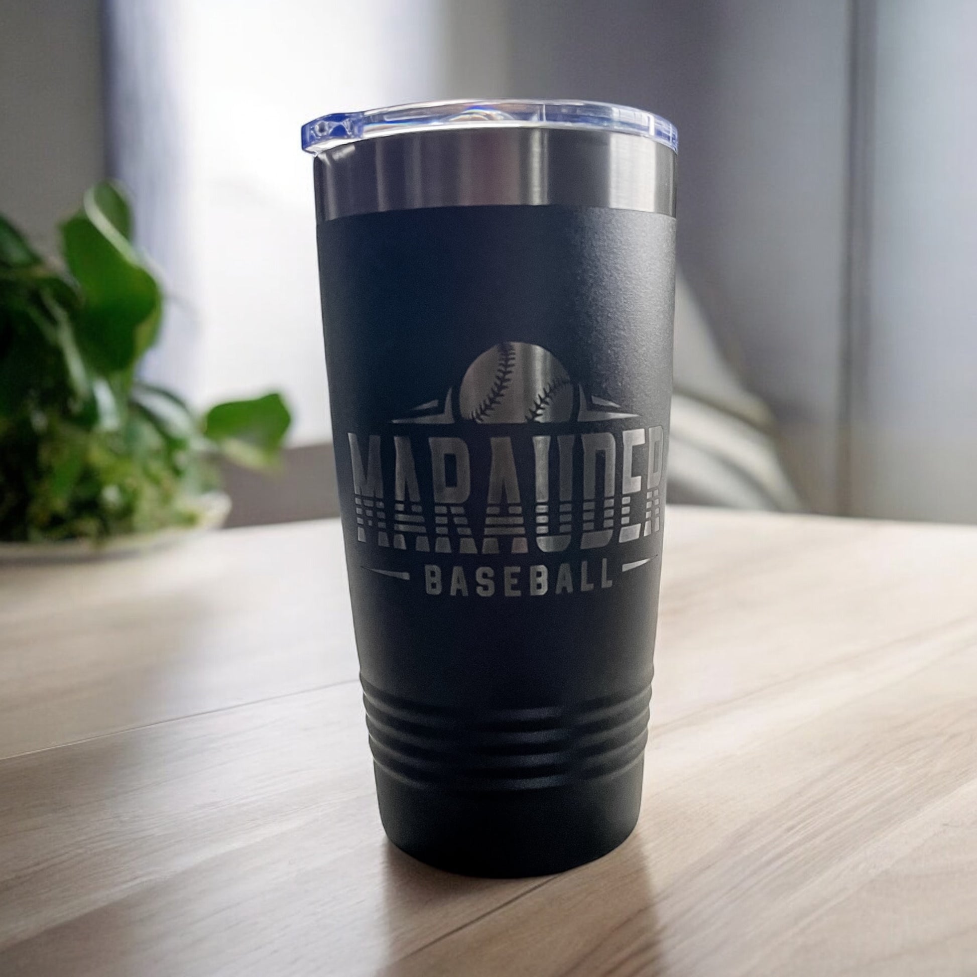 Show your school spirit while you keep hydrated and cheer on your favorite baseball player! This 20 oz. laser-engraved tumbler engraves ghost black on black for that modern look.