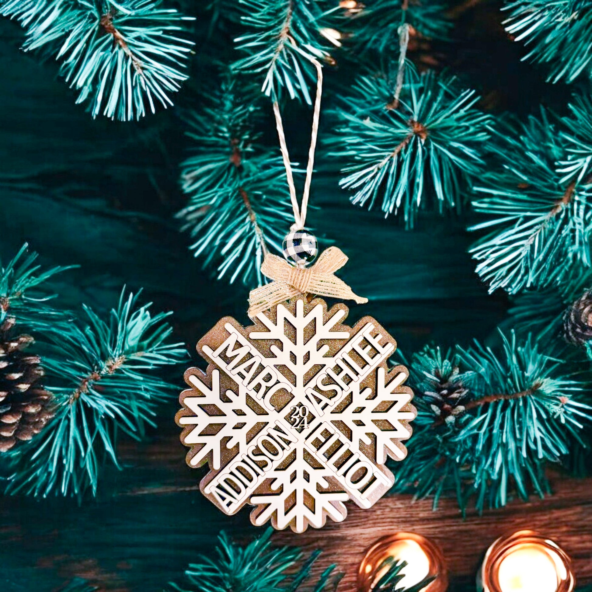 • Laser-cut names within the snowflake design (up to 12 names)