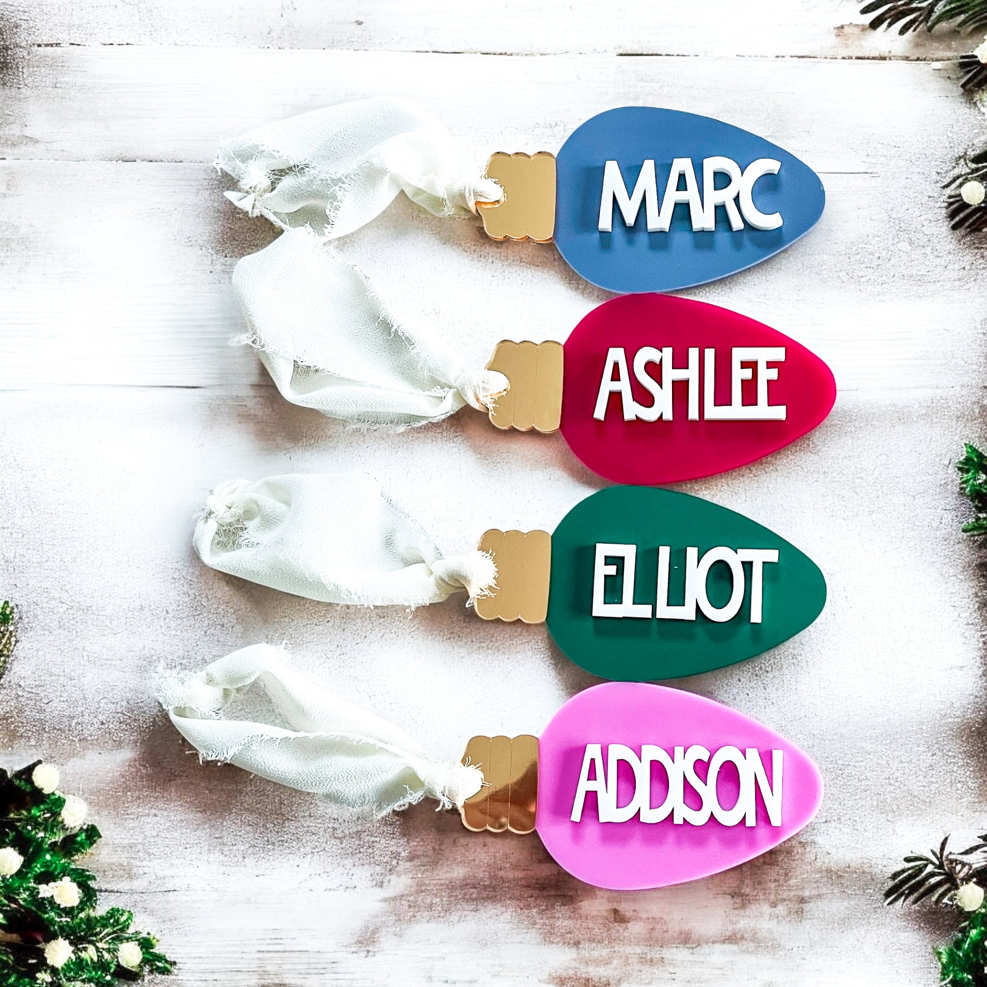 Add a trendy touch to your holiday decor with our Personalized Light Bulb Ornament! Made from premium acrylic with a stylish chiffon ribbon and a mirror gold acrylic topper, this ornament is a stunning addition to any tree.